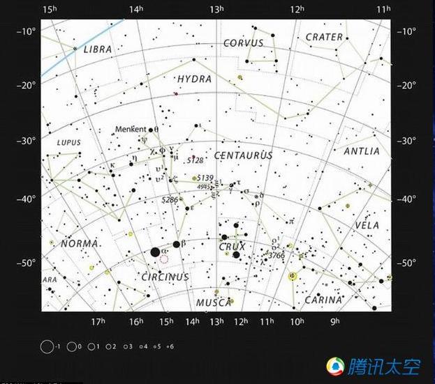 该图表显示晴朗夜空下人类肉眼可看到的星球,比邻星是最接近太阳系的恒星,图中以红色圆圈标注。这颗恒星过于昏暗,很难通过肉眼进行观察,但是使用小型望远镜可以观测到。