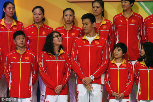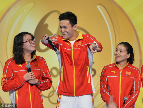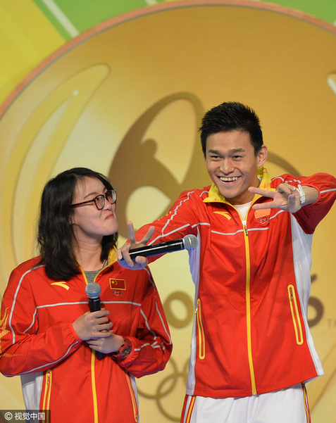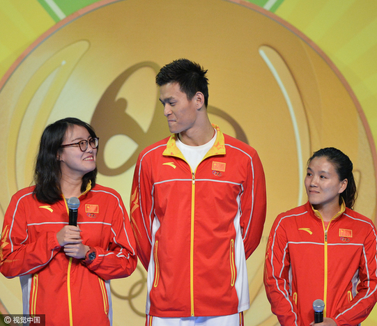 8月28日,香港举行“奥运精英约定你”大汇演,里约奥运会内地奥运精英代表团与香港市民见面,众将挑战花式表演,图为孙杨卖萌小师妹傅园慧深情一望。