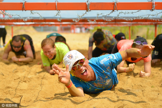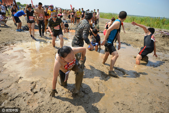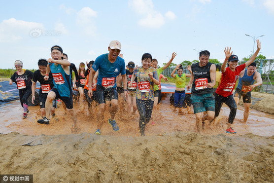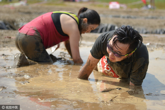 8月27日,约2000名中外选手齐聚上海滴水湖畔举行泥泞跑,他们通过团队合作,共同完成8公里赛道上分布的攀爬、匍匐、电击等30个关卡。摄影:方东旭/视觉中国