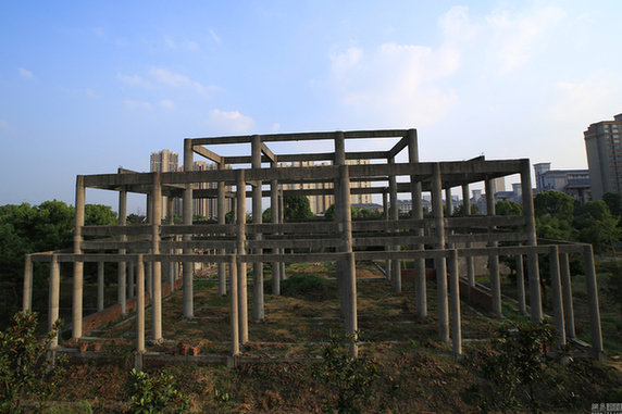 一座刻有双塔寺的大门屹立在园林中,地面散落着尚未使用的板砖,北边的道路也未修葺完成。据了解,这里原计划修建67米全国最高的双塔,而今却不见踪影。近年来,墨荷园越来越封闭,后期索性将所有的大门都锁起来,四周高墙耸立,布满防盗铁丝,可谓戒备森严。