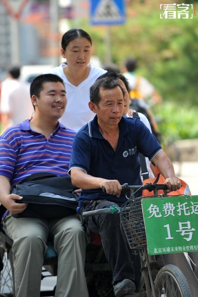 在中国,新生入学的场面堪比集体“搬家”。校园里行李包裹堆积,搬运成为难题。图为2010年8月25日,清华大学2010级大一新生报到,校内免费托运三轮车上的新生及家长。