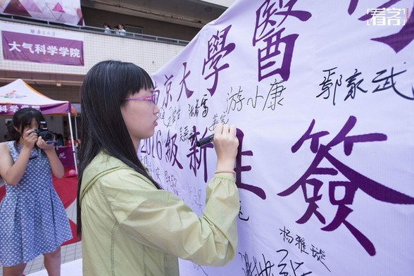2016年8月27日,江苏南京,在南京大学仙林校区,一名新生在学院迎新签名墙上签名。当日,3300多名来自全国各地的2016级本科新生开始陆续来到南京大学报到入学,正式开启大学生活。