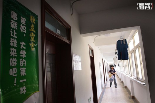 2011年8月31日,江苏南京,南京一所大学宿舍走廊里走过一名刚报到的大学新生,宿舍门口贴有“独立宣言”。