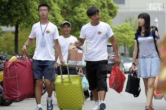 2013年8月25日,江苏南京,东南大学校园里前来开学报到的大学新生,两名学长帮助一名新生搬运行李。