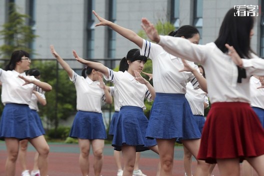 学长学姐们欢迎新生的方式各不相同,花样百出。图为2014年8月31日,江苏扬州,一所高校的学姐们穿统一服装,跳起开学版的“小苹果”迎接新生。