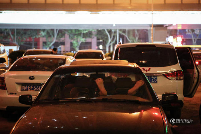 2016年4月26日,住院部开始熄灯,许多家属不得不在车里“安了家”,狭小的空间往往伸不开腿。赵龙翱/视觉中国