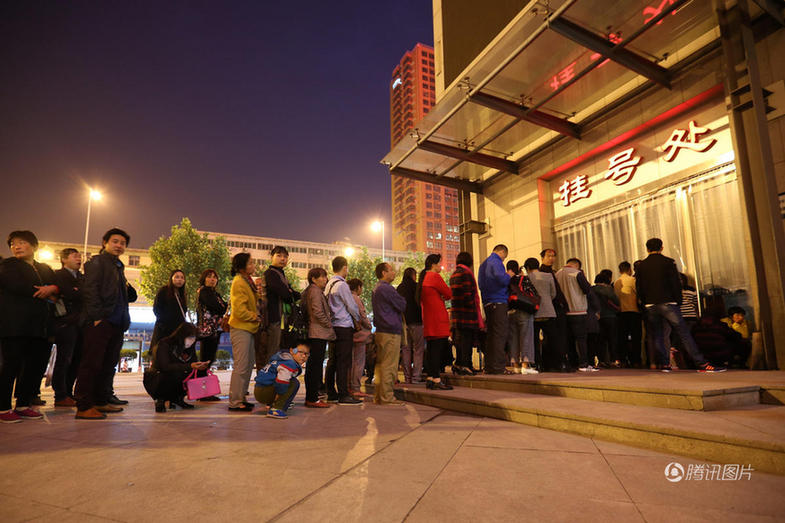 2016年5月9日,凌晨4点天还未亮,在郑大一附院的挂号处的门前已经聚集了近百人,他们排成两队,和身后的路灯一起守在夜色里 ,一个和家人一起来看病的孩子等累了,蹲在地上休息。赵龙翱/视觉中国