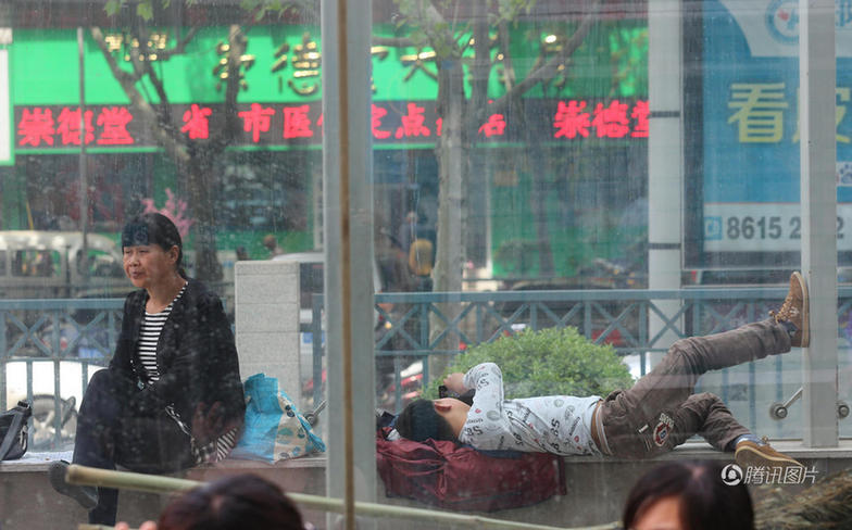 2015年4月14日,一位母亲带着孩子来此看病,下午医生上班之前,她们坐在地下停车上出口的台阶上休息。赵龙翱/视觉中国