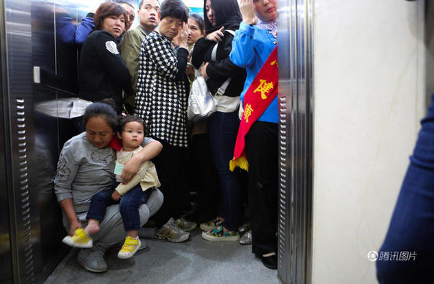 2016年4月18日,每天看病的人和看完病的人拥堵在电梯口,慌乱中,一位女童的鞋被挤掉了,身后的乘客抚着额头,不知是在擦汗还是在庆幸终于赶上了这趟电梯。赵龙翱/视觉中国