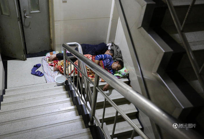 2016年4月26日,夜里11点半,郑大一附院病房楼梯间里鼾声渐起,一位中年人睡得正香,病房门开了,走出一位老人,躺在了他的身边,两人就这么侧着身,挤在一米宽的楼梯间里。赵龙翱/视觉中国