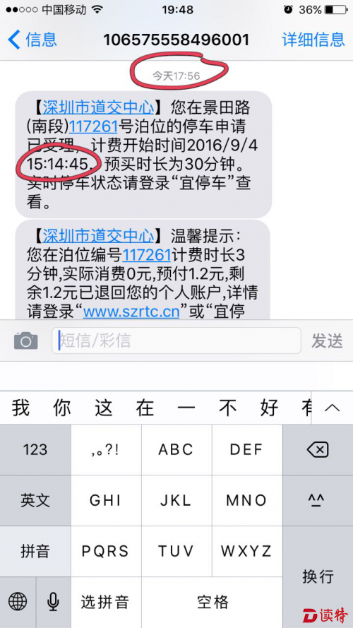 也有市民停好车顺利地输入了泊位号并缴费成功,但迟迟未收到短信提示。直到停车完成两个多小时后,才收到短信。他当时停了十多分钟,正常的话要按半小时收费标准付款,但系统没有收费,把他预付的车费也退还到了他的账户。他收到短信的时间为17:56,应该就是“宜停车”系统修复好的时间。