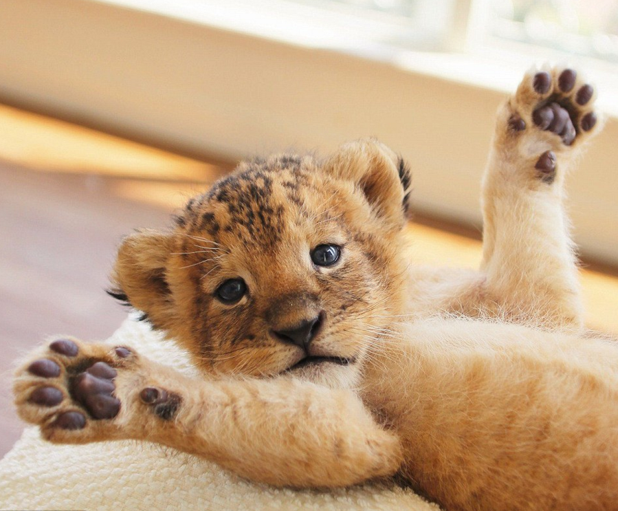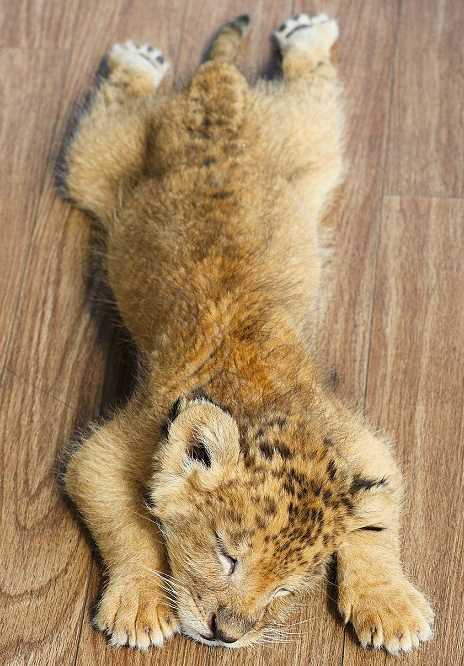 小狮子张开双爪,似乎在求抱抱。这家动物园内有一个爱畜乐园,游客们可以在乐园内和这些可爱的幼崽们合影。