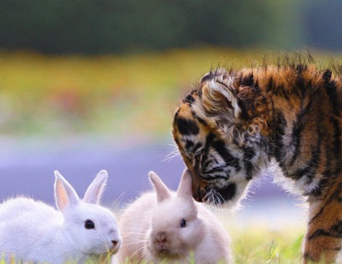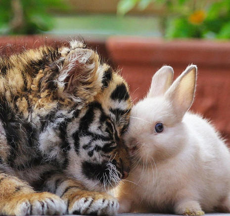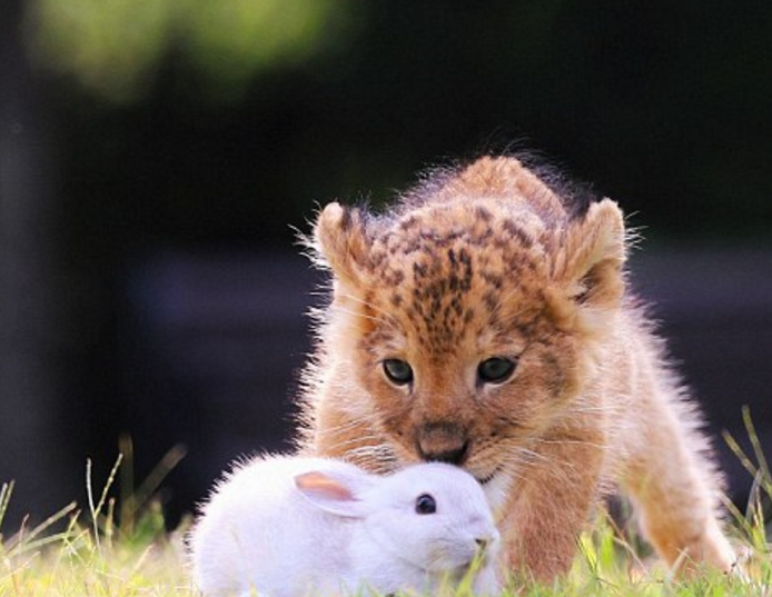 这些照片显示,几个月大的狮子和老虎并未发展出野兽的习性,性格十分温和友善。图为小老虎与动物园里的小兔子贴面依偎在一起。