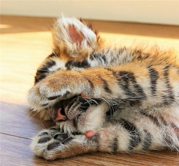 图为狮宝宝和虎宝宝在地板上亲密玩耍,十分有爱。