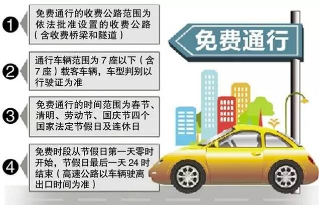 根据《重大节假日免收小型客车通行费实施方案》,高速公路免费通行的的具体政策如下:(一)免费通行的时间范围为春节、清明节、劳动节、国庆节等四个国家法定节假日,以及当年国务院办公厅文件确定的上述法定节假日连休日。免费时段从节假日第一天00:00开始,节假日最后一天24:00结束(普通公路以车辆通过收费站收费车道的时间为准,高速公路以车辆驶离出口收费车道的时间为准)。