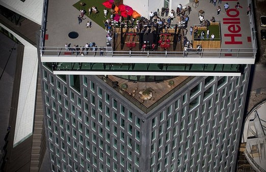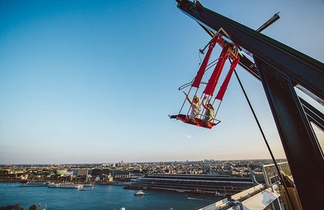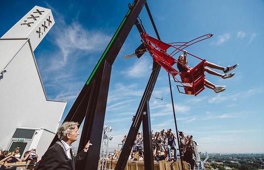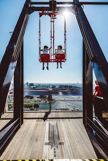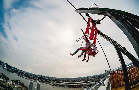 秋千上的游客悬浮于22层楼的高空,可以俯瞰阿姆斯特丹的美景,历史中心、红灯区和一些著名港口等皆尽收眼底。