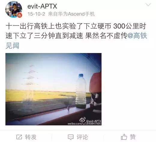 各路中国网友开始踊跃证明,用一元硬币在高铁上做起了立硬币实验(一元人民币厚度是1.85毫米),结果硬币依然傲然挺立,表示毫无压力。