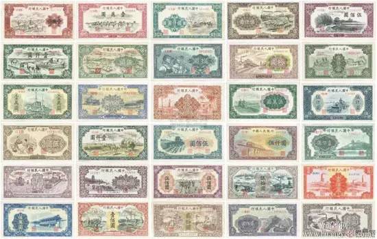 第一套人民币于1948年12月发行,从一元到伍万圆一共有十二种不同的面额,而且所印制的图案多大62种。其中1元券2种、5元券4种、10元券4种、20元券7种、50元券7种、100元券10种、200元券5种、500元券6种、1000元券6种、5000元券5种、10000元券4种、50000元券2种。