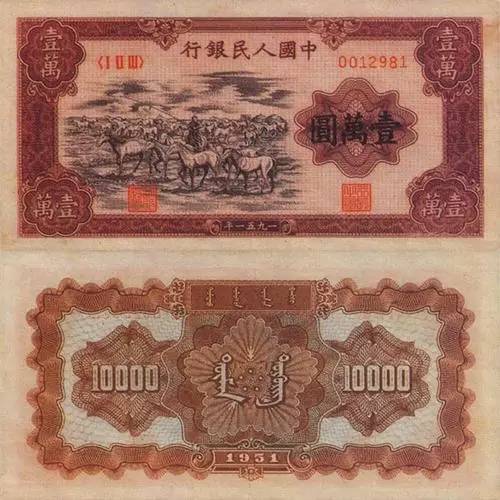 牧马币是1951年一万元中的牧马图,其正面左侧是牧马图,背面则是花纹以及蒙文的行名和面值。因为是第一套人民币中的币种,受当时的工艺限制,做工比较粗糙,并且纸张也不易保存。