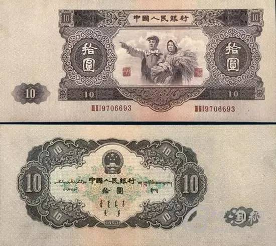 53版10元人民币是我国委托苏联代为印制的一种纸币,当时我国的印刷技术还不够成熟,而且当时我国与苏联的关系比较紧密,但是好景不长,由于整治原因,这张纸币还未发行多久就被收回,所以存世量相当稀少。随着收藏大军的不断涌入,这张纸币受到的追捧程度越来越高,俨然成为了第二套人民币中的“币王”。