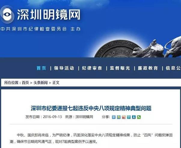 中秋、国庆即将来临,9月 13日,深圳市纪委通过其官网明镜网,又在节前集中通报了一批违反八项规定精神的典型问题,为趁节日“乱伸手”敲警钟,进一步严明纪律,巩固深化落实中央八项规定精神成果,防止“四风”问题反弹回潮,确保节日期间风清气正。