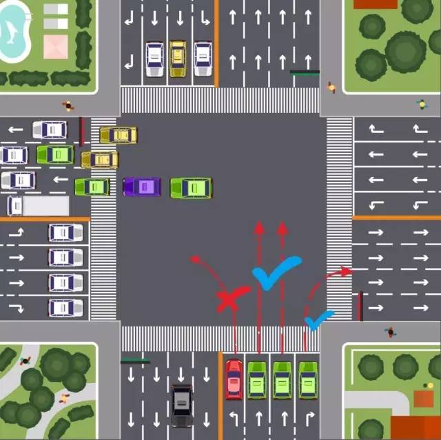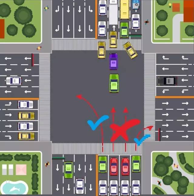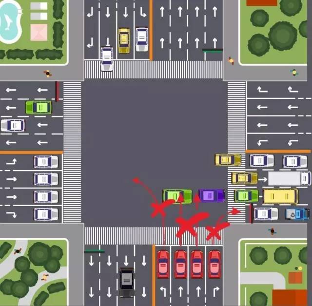2、左转、直行、右转方向交通阻塞的,各车道内车辆均不得进入路口,违规进入的,认定为“冲绿灯”。▼