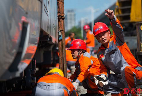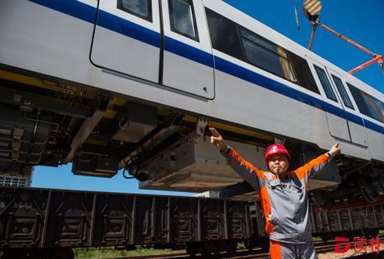 新车抵达车辆段后将进行一系列的调试工作,调试工作结束后列车将投入试运行。在一切准备工作完毕后,10月底,您就可以购票乘坐“小清新”列车在地下穿梭了!是不是很期待呢?图为工人指挥调工人指挥调整车厢安放位置。整车厢安放位置。
