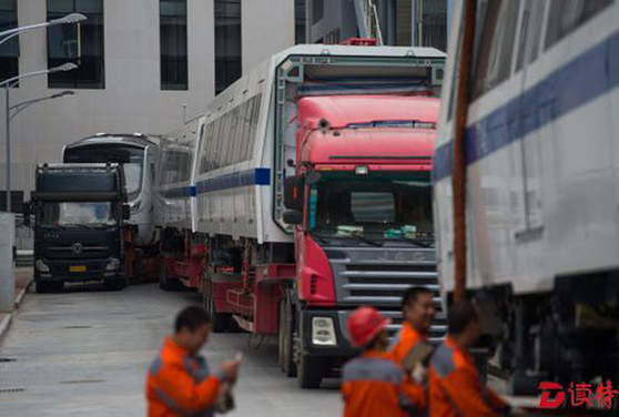 列车在蛇口货运站由工程人员进行拆分,吊车将每节车厢依次吊起并安置于货运平板卡车上,货车载着地铁车厢抵达地铁车辆段后,吊车要再次将车厢吊起,最终工人要和吊车配合作业,将车厢安置在车辆段的轨道之上并重新联结。图为地铁列车需要一节节运输至地铁车辆段。