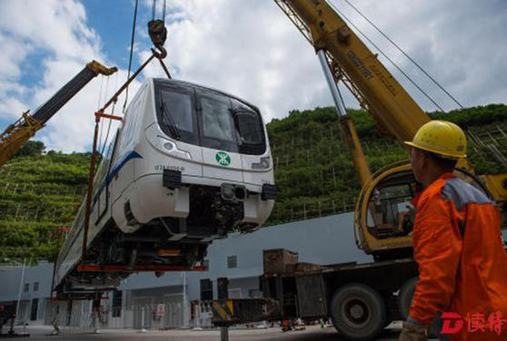 地铁车厢被再度吊起,准备安放在车辆段的铁轨上。