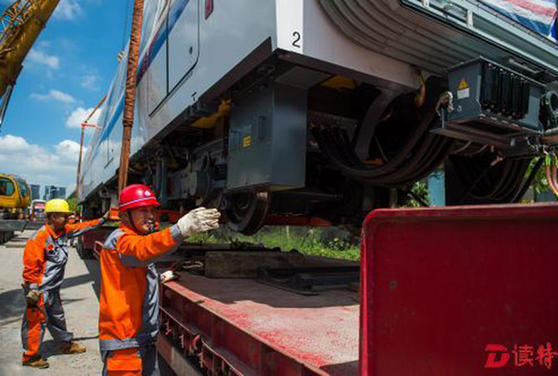 新车抵达车辆段后将进行一系列的调试工作,调试工作结束后列车将投入试运行。在一切准备工作完毕后,10月底,您就可以购票乘坐“小清新”列车在地下穿梭了!是不是很期待呢?图为工人指挥调工人指挥调整车厢安放位置。整车厢安放位置。