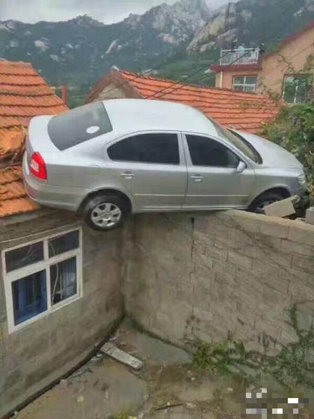 据潍坊交警消息,青岛崂山区雕龙嘴村,一司机倒车倒大了,冲上了村民的屋顶。