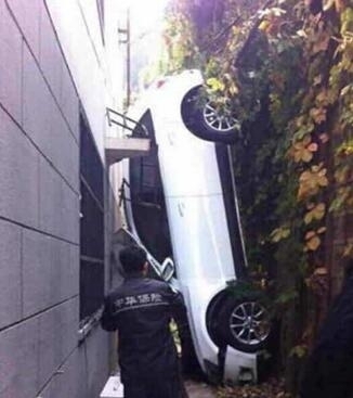 河北承德一名女司机错把油门当刹车,汽车冲下高坡,夹在楼房与坡道的夹缝之中。