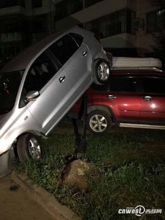 昨晚(8月29日)8点多,在西安市白沙路的培华小区内,一名女司机开着一辆银色大众轿车在倒车时,先是刮蹭了路边的一辆红车,又撞上了后面的一辆自行车,最后径直压过路灯倒到另一辆车上,只见这辆银色车45度角,车头栽在地上,车尾两轱辘压在别车车顶,前后保险杠都被撞坏。所幸人员都无大碍!