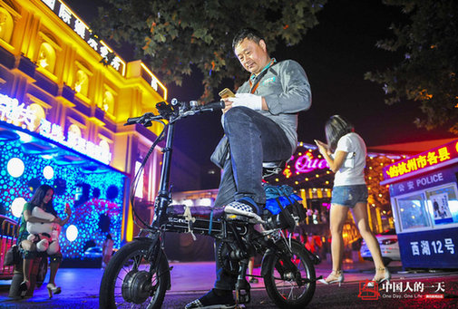 接单到位的第一件事是拆车装车。做代驾,是夜夜在声色欢醉的各扇门外,寻找等待。手机、电池、折叠车就是生产工具。收入的门道就是规范操作、哄娃的情商和优质服务纪录。每晚,老翟在这个他两次获得重生的西湖之城绕行穿梭,牺牲的是喝茶的爱好,得到的是继续重启生活的路。
