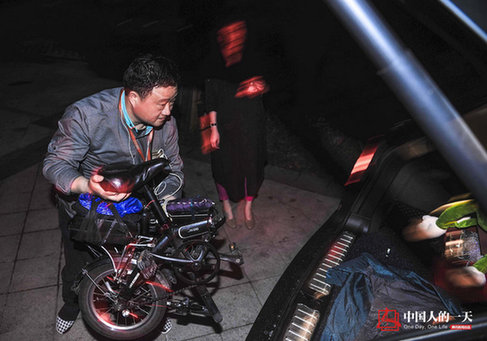 接单到位的第一件事是拆车装车。做代驾,是夜夜在声色欢醉的各扇门外,寻找等待。手机、电池、折叠车就是生产工具。收入的门道就是规范操作、哄娃的情商和优质服务纪录。每晚,老翟在这个他两次获得重生的西湖之城绕行穿梭,牺牲的是喝茶的爱好,得到的是继续重启生活的路。