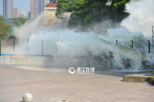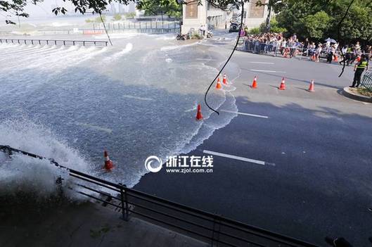 下午3时10分许,大潮来袭,巨大的潮水打上岸,之江路珊瑚沙路段满是积水。