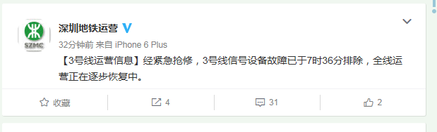 【最新】19日早上8点左右,深圳地铁微博发出信号设备故障已排除的信息。“经紧急抢修,3号线信号设备故障已于7时36分排除,全线运营正在逐步恢复中”。