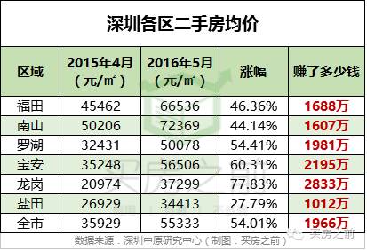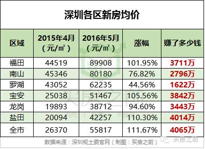 经过去年330政策的刺激,这一年来深圳房价基本上都翻倍了。从新房价格来看,全市涨幅是111.67%,如果3640万在深圳买房,同个时间段买卖,那么可以赚 4065万元!
