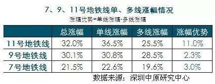 通过7号和9号地铁线上单线、多线涨幅以及涨幅优势与11号线的对比,发现7、9号线单线涨幅均高于多线涨幅。