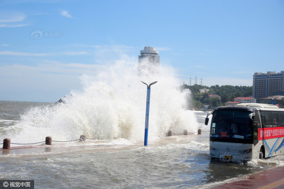 图为芝罘区滨海路,岸边停靠车辆被大浪侵蚀。