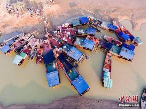 航拍大旱下的鄱阳湖:河床干涸渔船靠岸