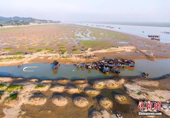 航拍大旱下的鄱阳湖:河床干涸渔船靠岸