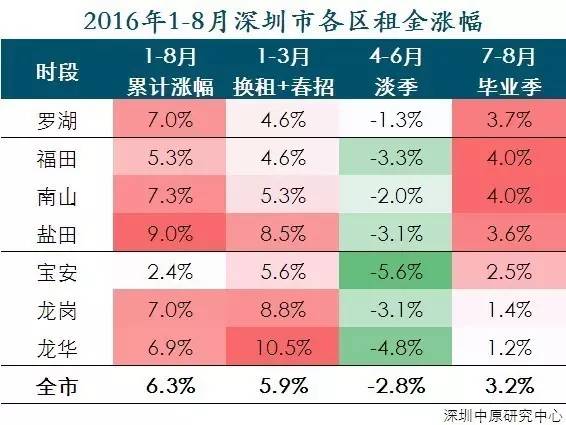 4-6月淡季租金水平回落很明显,大涨的龙华回落了5个百分点,龙岗之前的8.8%的涨幅,立即又跌下去3个点,这也跟去年投资客大批进入后房源大幅增加有关。
