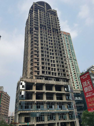 东门大厦位于东门中路和湖贝路的交汇处,已经烂尾了 20 年。因存在安全隐患,今年 7 月,拆除公司进场对东门大厦外脚手架进行拆除。8 月底,脚手架拆除工作基本完成。8 月 23 日,一纸落款为东门街道办事处的公函发往了深圳市国融房地产开发有限公司(以下简称“国融地产”)。公函称,东门大厦外脚手架拆除工作已进入尾声,但大厦外墙部分钢架、玻璃幕墙及中高层部分“模板”等建筑垃圾存在较大安全隐患的可能性。请国融地产及时排查处置。