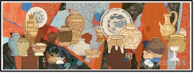 七千年以前,深圳地区便初现文明的曙光,陶器和瓷器不仅是“火”与“土”的艺术,更是人类生活的伴侣。车站将深圳陶瓷历史融入地铁文化之中,提其器型、炼其色彩,用现代高温彩釉的工艺语言予以全新表现,以“火”代笔、以“土”作色,用色块分割的手法布局画面,绘就一曲“以瓷颂瓷”的华美乐章。