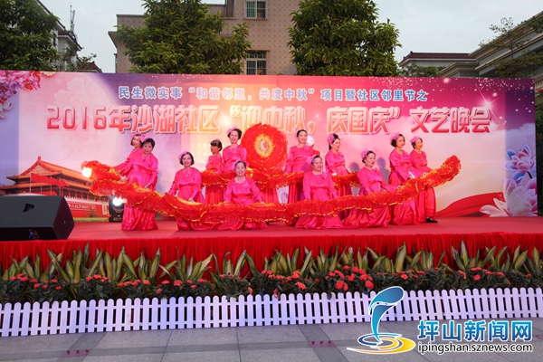 深圳新闻网坪山讯(记者 史韬 邱嘉熙 通讯员 李海 吴玲敏)日前,沙湖社区举办了民生微实事“和谐邻里,共度中秋”项目暨社区邻里节之2016年沙湖社区“迎中秋、庆国庆”文艺晚会。晚会由沙湖社区党委主办,旨在通过开展文艺晚会的形式,丰富居民群众的文化生活,营造中秋传统节日喜庆氛围,表达对祖国繁荣昌盛的赞美之情,同时加强邻里沟通,团结广大居民群众以沙湖“整村统筹”土地整备为中心,共同建设美丽、和谐新沙湖。党员干部、各居民小组居民、企业职工及辖区60周岁以上老人等共计600多人观看了晚会。
