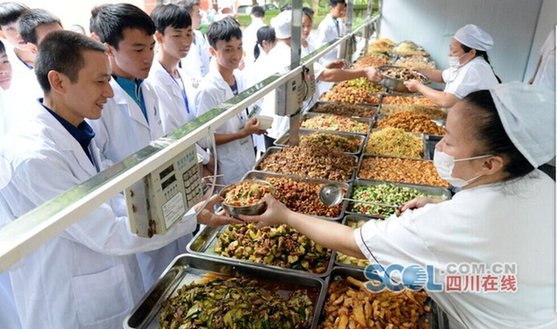 图为沈兴培和儿子在食堂就餐。