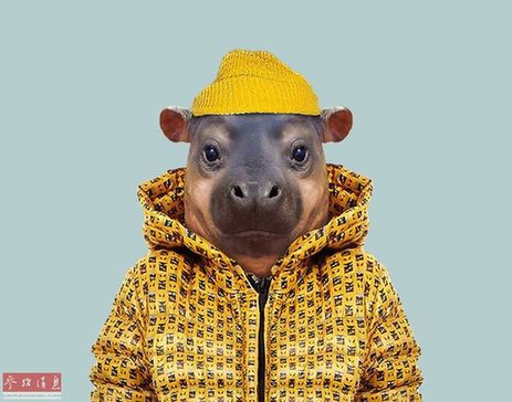 这些照片里,动物们都穿上了人类的服装,每张照片里都突出了它们表情的细节。图为倭河马。