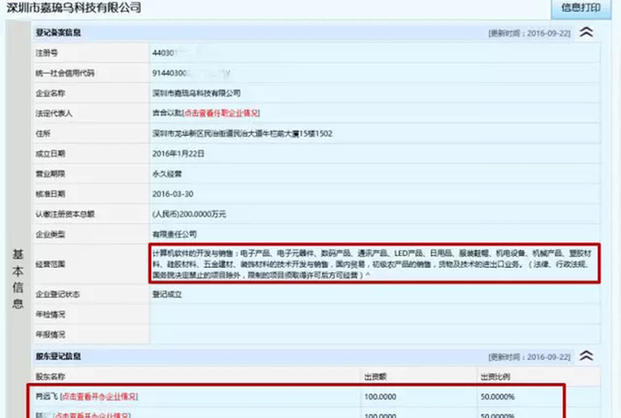 从工商注册的信息来看,她是两家公司的法人,4家公司的大股东。这6家公司的注册地址,分别在深圳市龙华新区、福田区、南山区等,几乎包括了深圳市管辖的所有辖区。从注册资金来看,从100万元到200万元不等,6家公司的注册资金达到了900万元。
