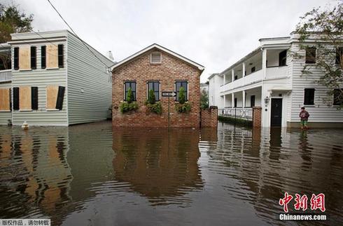 飓风“马修”登陆美国 房屋被淹民众划船出行